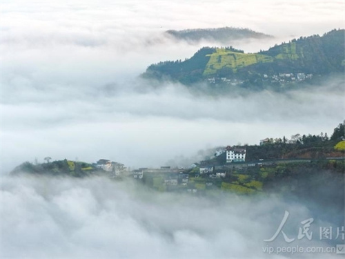 清晨云雾漫山,金黄花海与白墙黑瓦若隐若现,航拍、徒步都出片。
