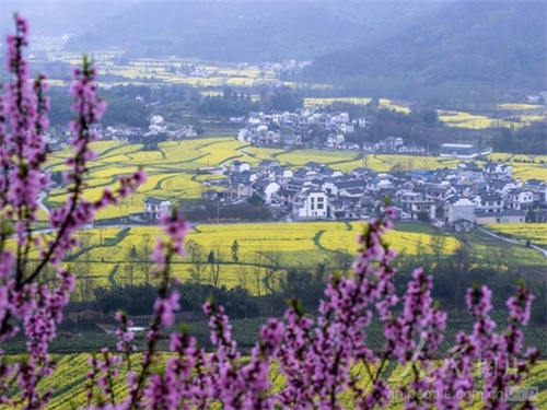 看点:盆地式万亩连片油菜花,视野开阔、金黄一片,徽村民居点缀其中。